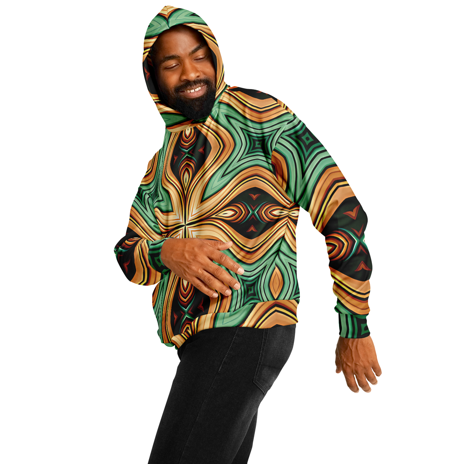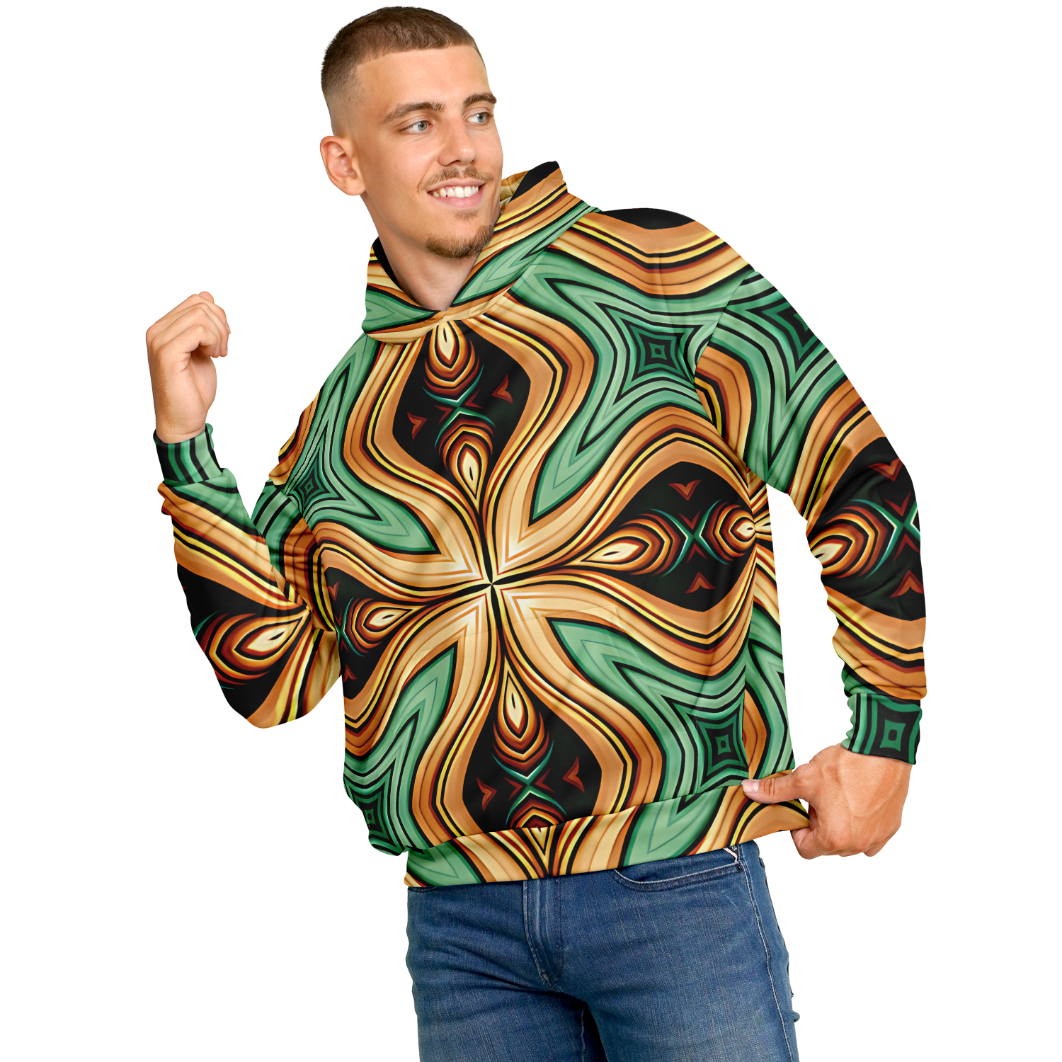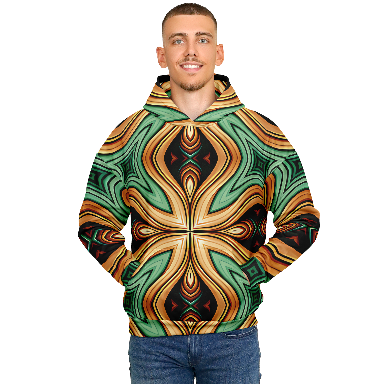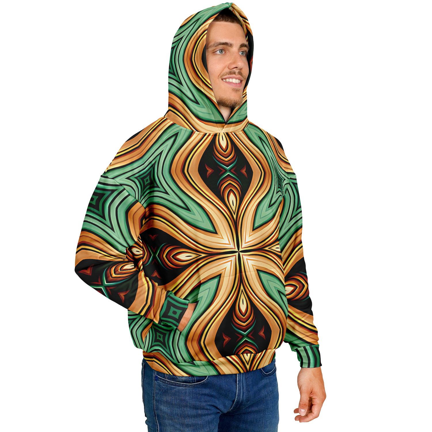 Men's Green & Gold Retro Kaleidoscope Pattern Heavyweight Oversized Hoodie