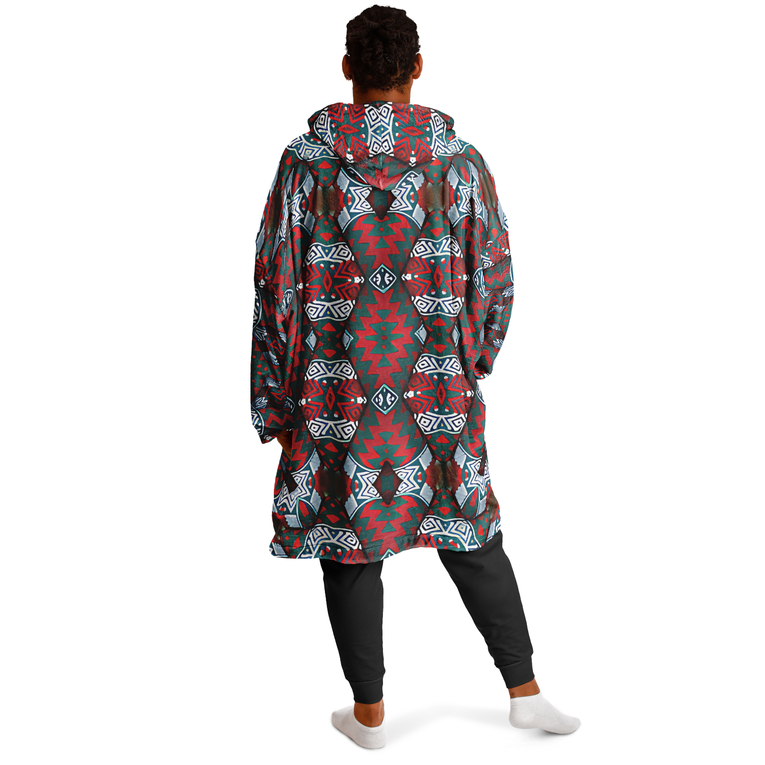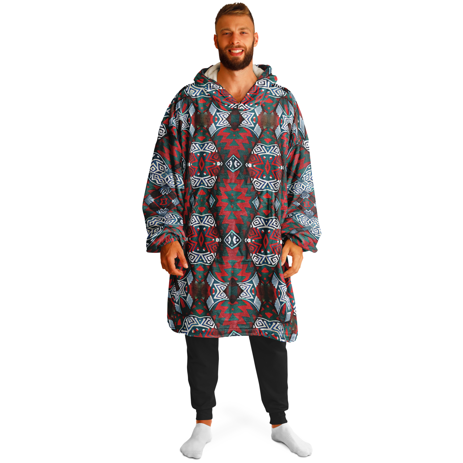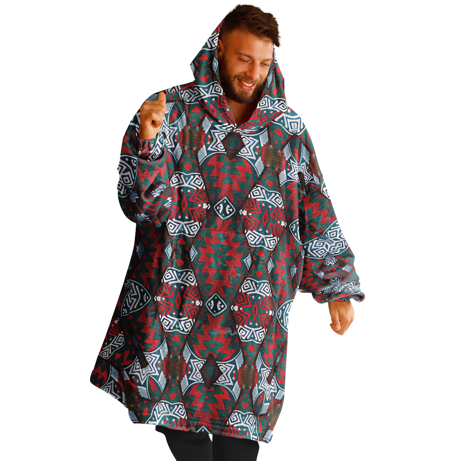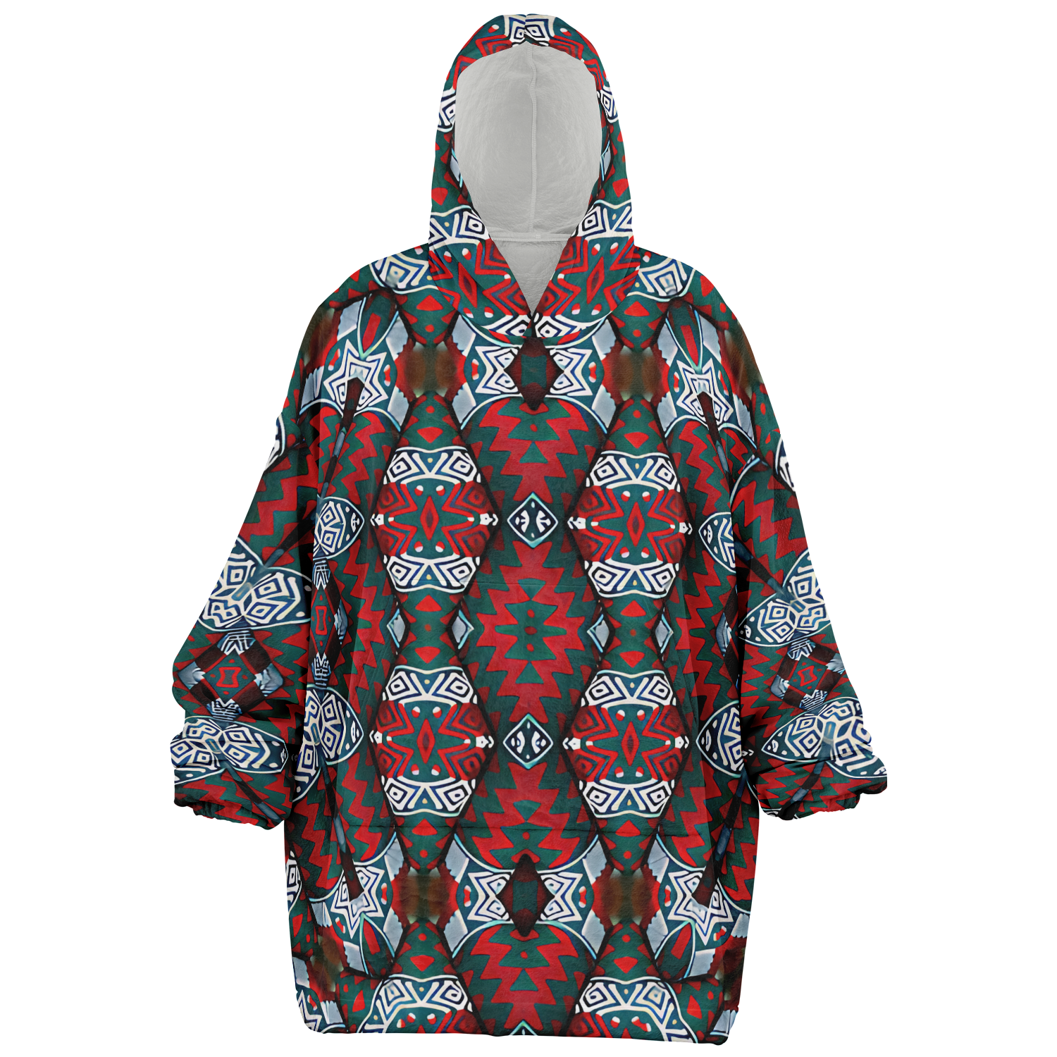 Men's Red & Teal Geometric Pattern Snug Hoodie Economy