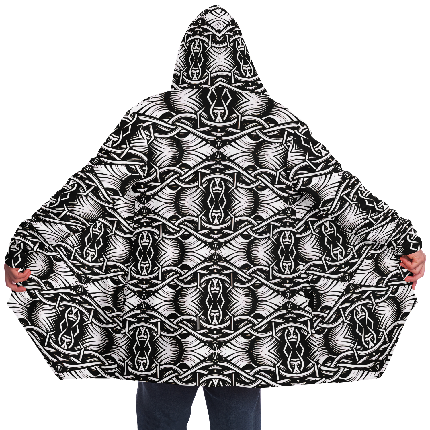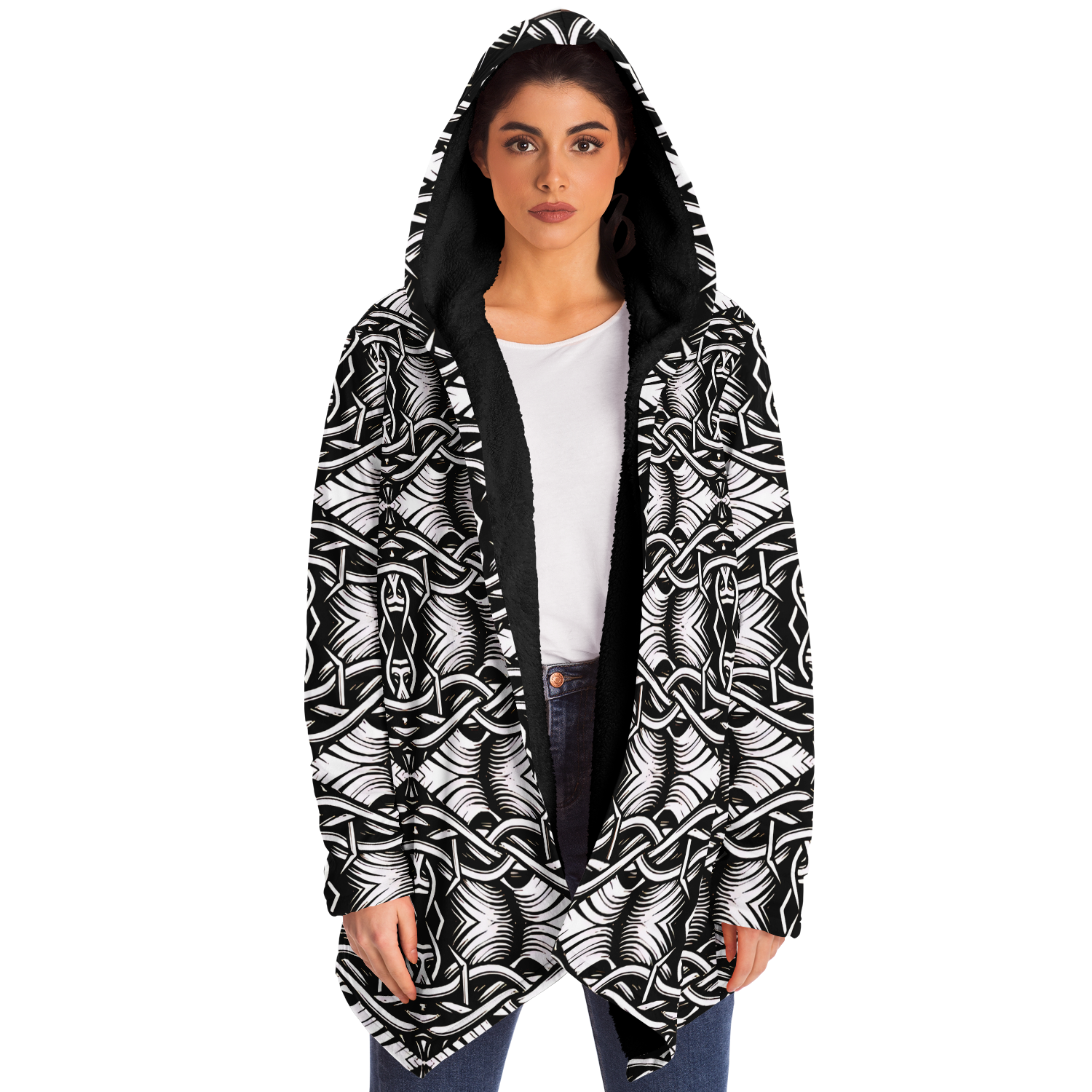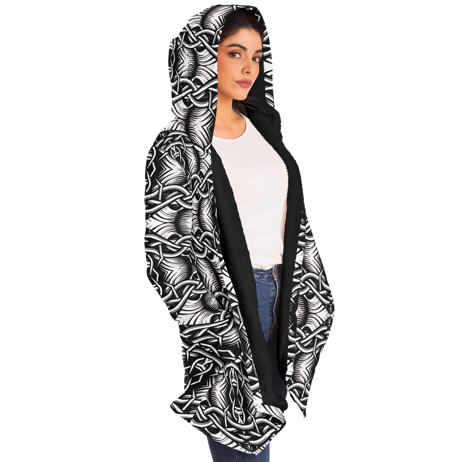 Women’s Black Intricate Silver Chain Tattoo Pattern High Microfleece Cloak